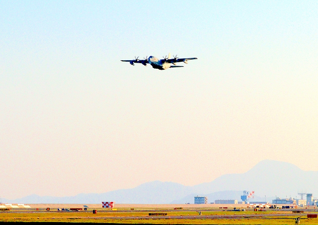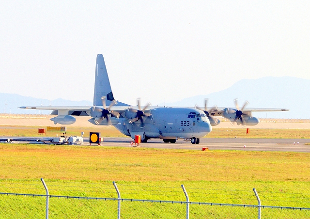 米海兵隊 KC-130J 空中給油機 スーパーハーキュリーズ(岩国基地)、QD 7923番機が離陸 |