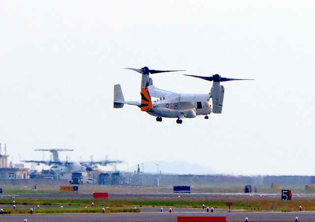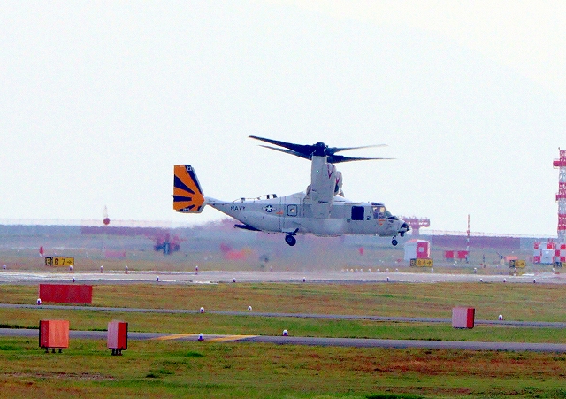 米海軍艦載機 CMV-22B オスプレイ、21-9446番機が着陸。中の中期場に