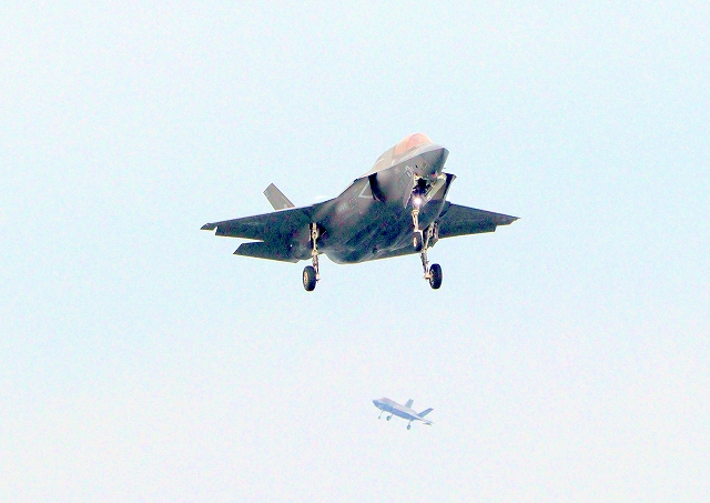 米海兵隊 F-35B ライトニングⅡ 戦闘機(岩国基地)、VK、06番機が着陸 14時41分に離陸した機。1時間16分の飛行でした。 |
