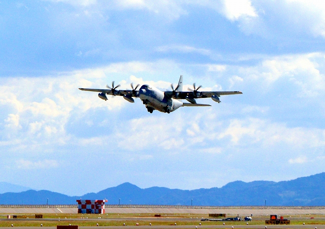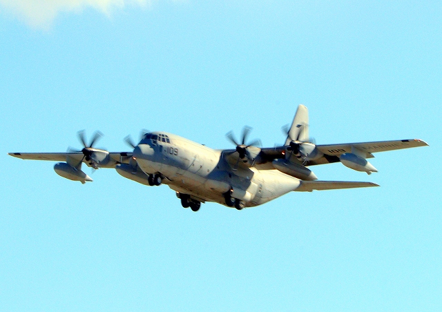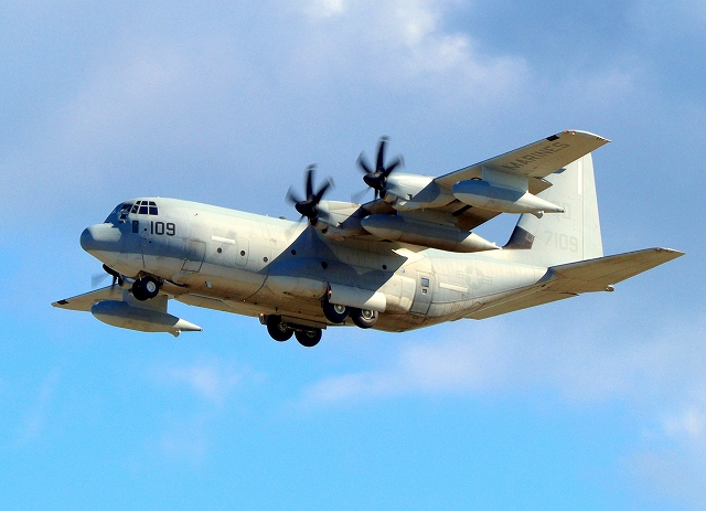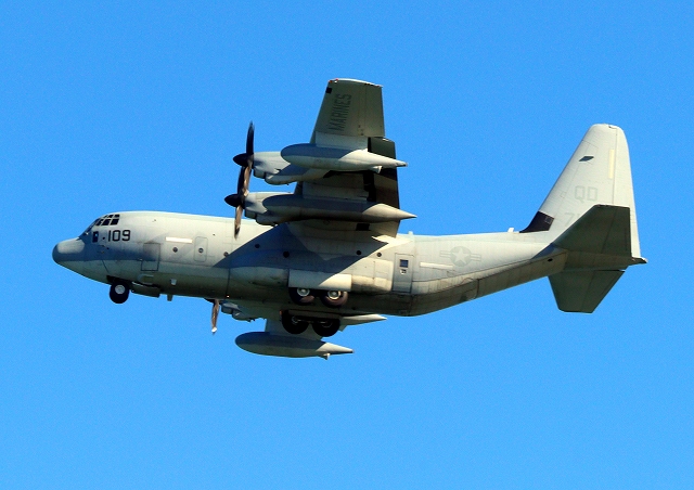 米海兵隊 KC-130J 空中給油機 スーパーハーキュリーズ(岩国基地)、QD 7109番機が旋回 |