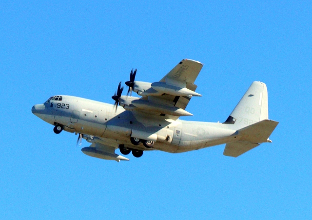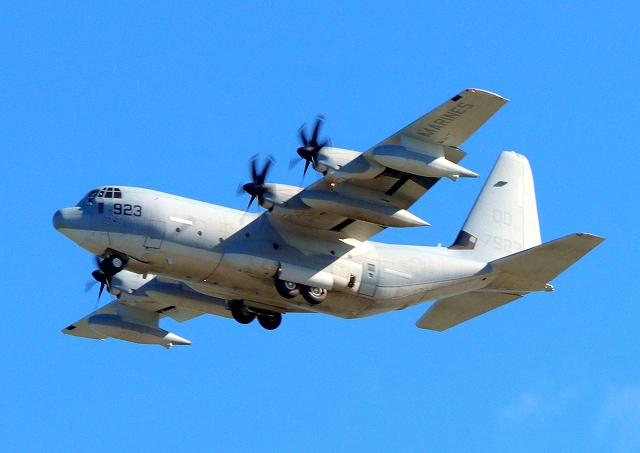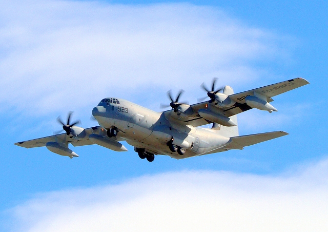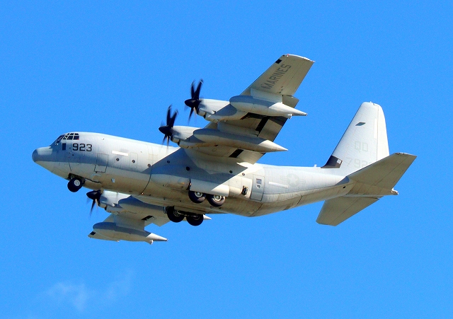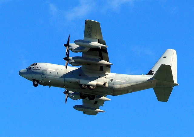 米海兵隊 KC-130J 空中給油機 スーパーハーキュリーズ(岩国基地)、QD 7923番機が旋回 |