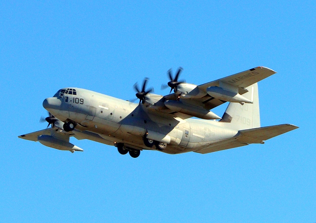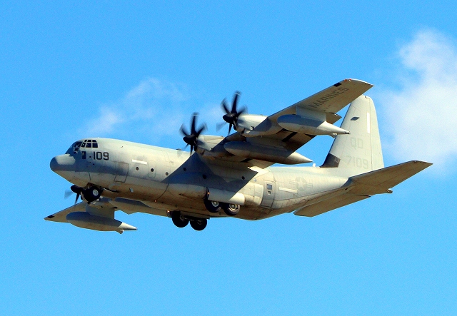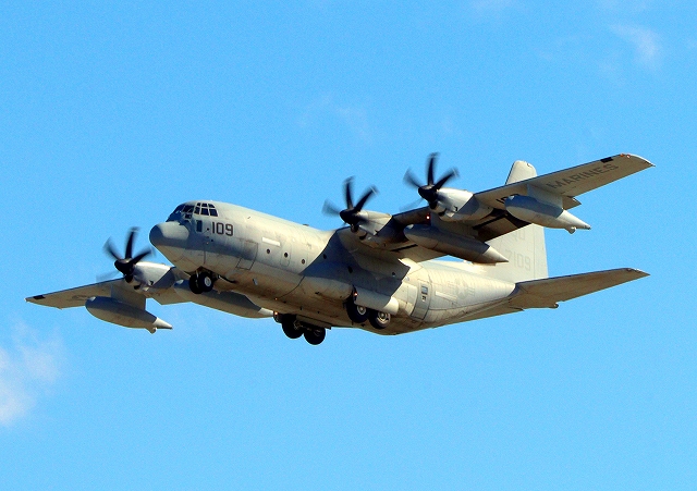 米海兵隊 KC-130J 空中給油機 スーパーハーキュリーズ(岩国基地)、QD 7109番機が旋回 |