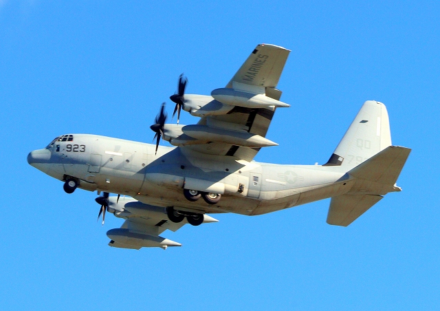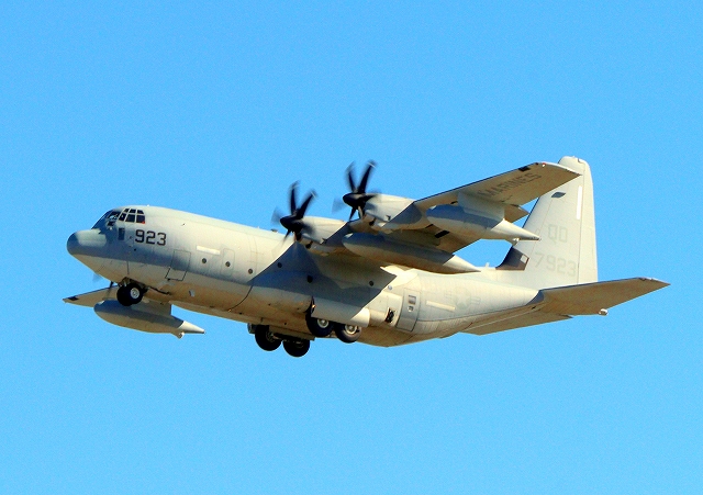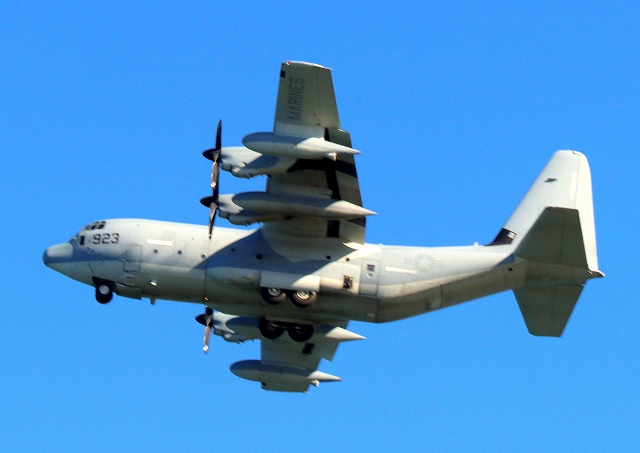 米海兵隊 KC-130J 空中給油機 スーパーハーキュリーズ(岩国基地)、QD 7923番機が旋回 |