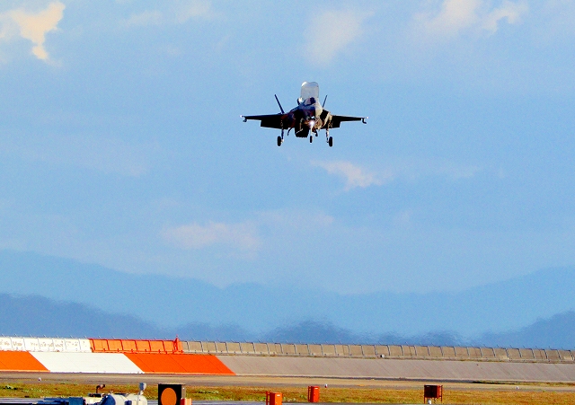 米海兵隊 F-35B ライトニングⅡ 戦闘機(岩国基地)、DT、27番機は垂直着陸パッドの上に着陸