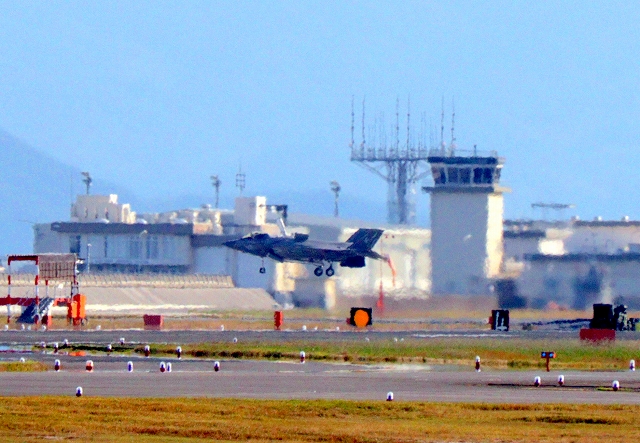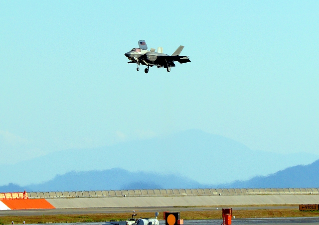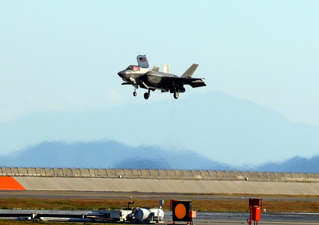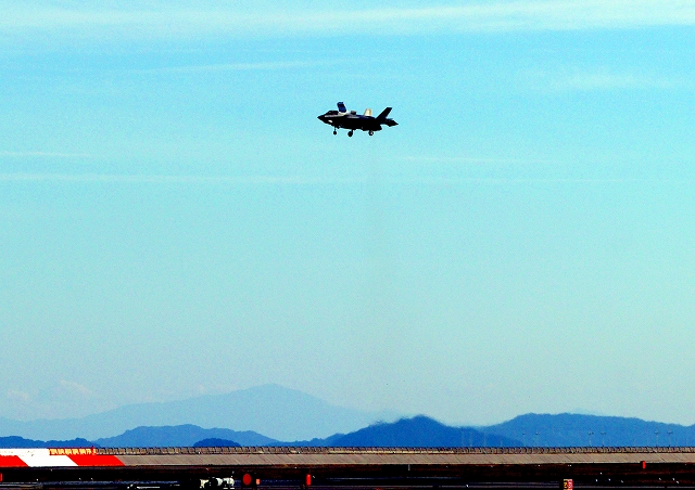 米海兵隊 F-35B ライトニングⅡ 戦闘機(岩国基地)、DT、21番機が帰還、垂直着陸パッドの上でホバリング |