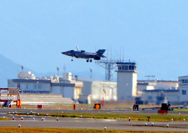 米海兵隊 F-35B ライトニングⅡ 戦闘機(岩国基地)、DT、21番機が帰還、垂直着陸パッドの上に着陸 13時57分に離陸した機。1時間07分の飛行でした。 |
