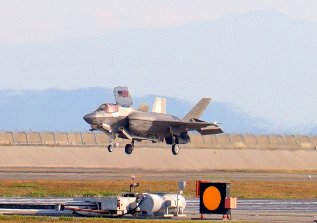 米海兵隊 F-35B ライトニングⅡ 戦闘機(岩国基地)、DT、21番機が、垂直着陸パッドの上でホバリング |