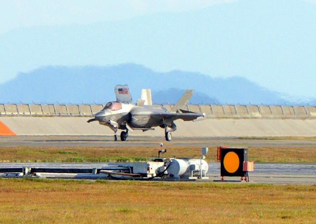 米海兵隊 F-35B ライトニングⅡ 戦闘機(岩国基地)、DT、21番機、垂直着陸パッドの上に着陸 14時01分に離陸した機。1時間39分の飛行でした。 |