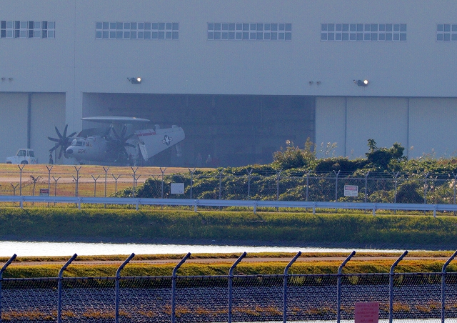 米海軍艦載機 E-2D アドヴァンスド・ホークアイ 早期警戒機(岩国基地)、604番機です。13時30分に着陸したということです。 |
