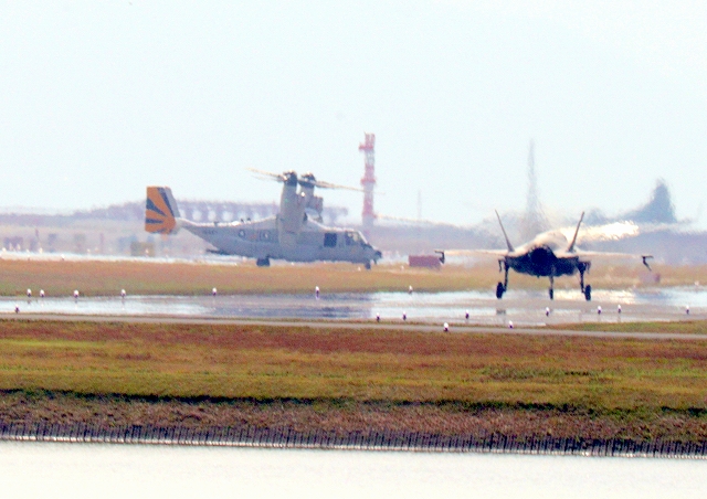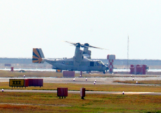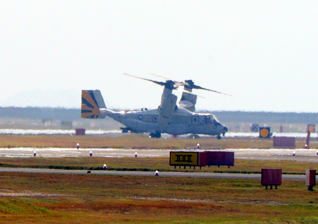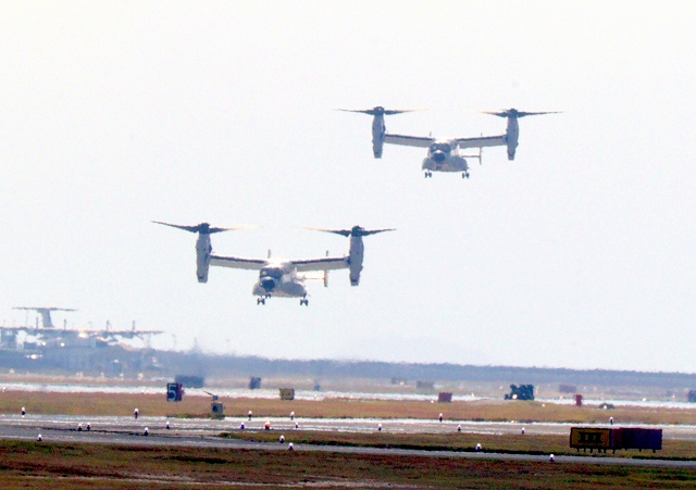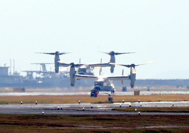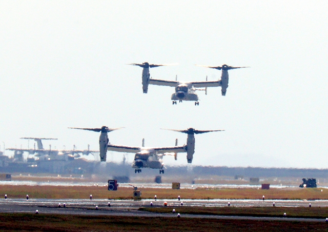 米海軍艦載機 CMV-22B オスプレイ、21-9446番機、22ー9452番機が着陸 |