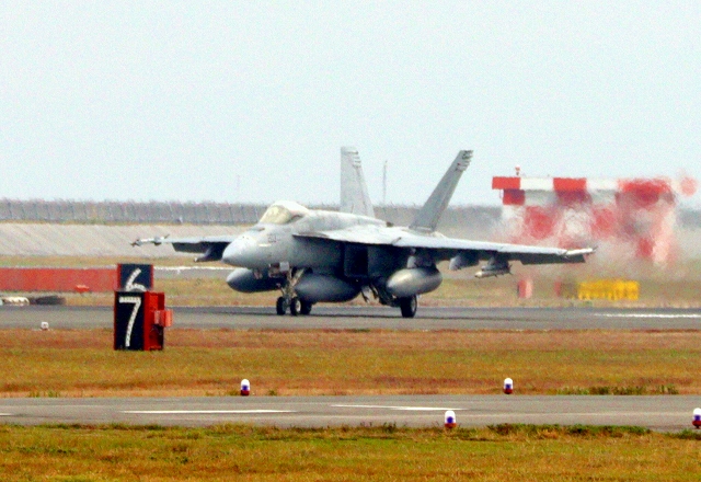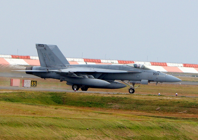 米海軍艦載機 F/A-18E スーパーホーネット 戦闘攻撃機(岩国基地)、NF、203番機が着陸 |