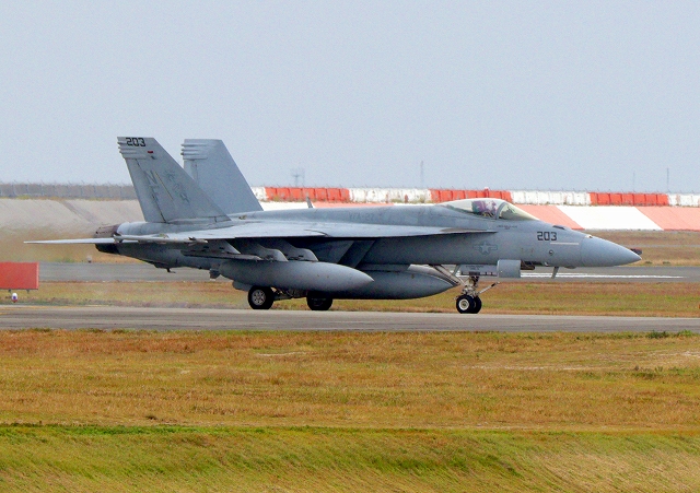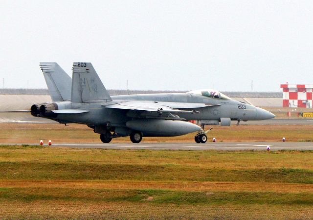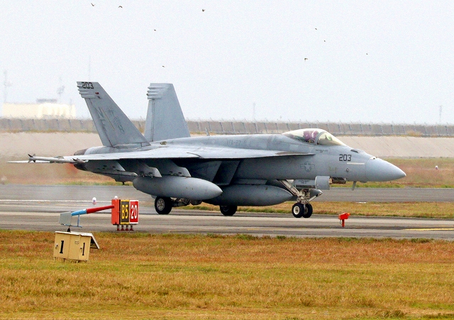 米海軍艦載機 F/A-18E スーパーホーネット 戦闘攻撃機(岩国基地)、NF、203番機が帰還 |