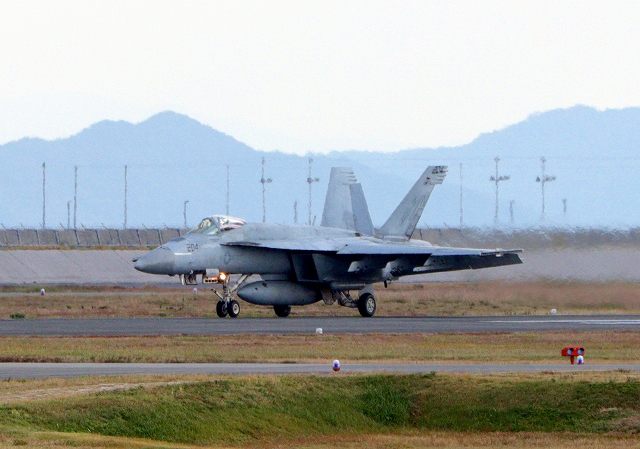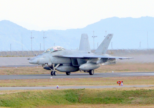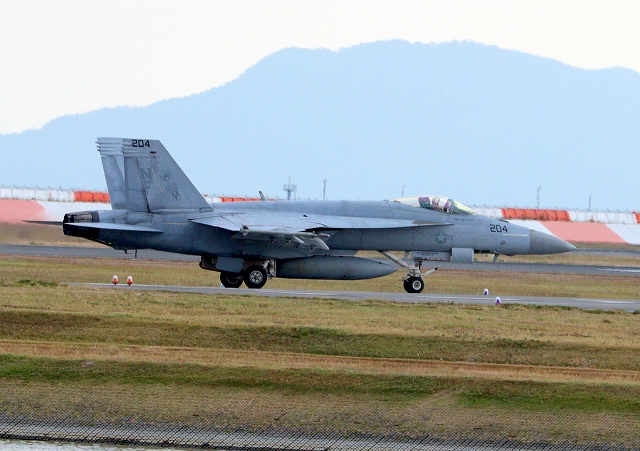 米海軍艦載機 F/A-18E スーパーホーネット 戦闘攻撃機(岩国基地)、NF、204番機が着陸 |