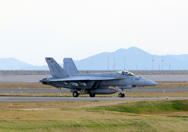 米海軍艦載機 F/A-18E スーパーホーネット 戦闘攻撃機(岩国基地)、NF、206番機が着陸 |
