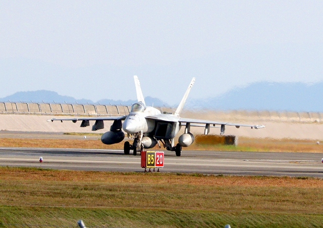 米海軍艦載機 F/A-18E スーパーホーネット 戦闘攻撃機(岩国基地)、NF、405番機が着陸 12時52分に離陸した機。1時間39分の飛行でした。 |