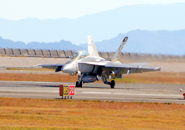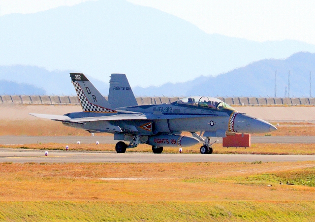 米海兵隊 F/A-18C ホーネット 戦闘攻撃機(岩国基地)、DR、312番機が着陸 |