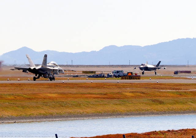 米海軍艦載機 F-35B ライトニングⅡ 戦闘機(岩国基地)、DT、30番機が着陸 前に米海兵隊 F/A-18C ホーネット 戦闘攻撃機(岩国基地)、DR、312番機 |