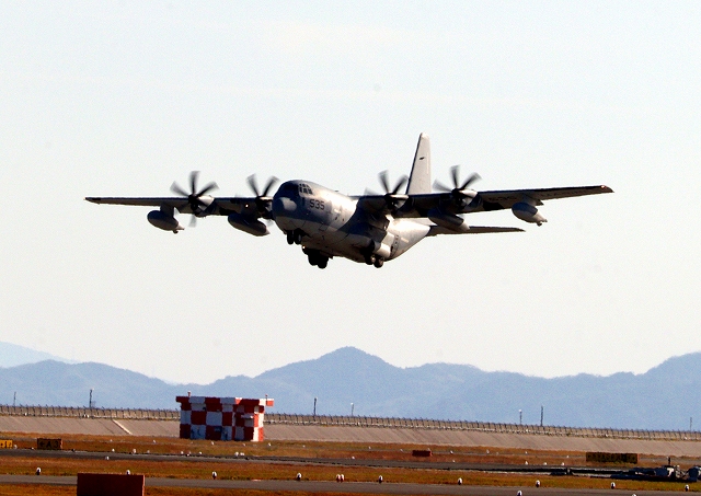 米海兵隊 KC-130J 空中給油機 スーパーハーキュリーズ(岩国基地)、QD 9535番機がタッチアンドゴーして旋回 |