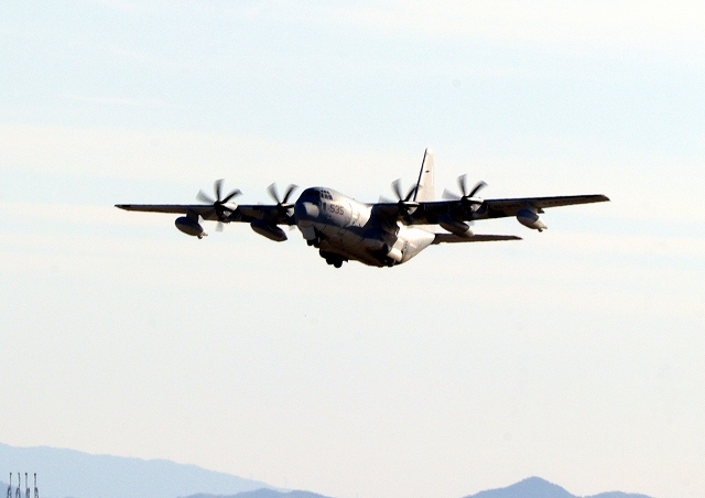米海兵隊 KC-130J 空中給油機 スーパーハーキュリーズ(岩国基地)、QD 9535番機がタッチアンドゴーして旋回 |
