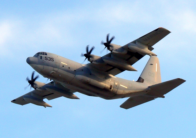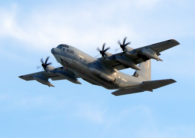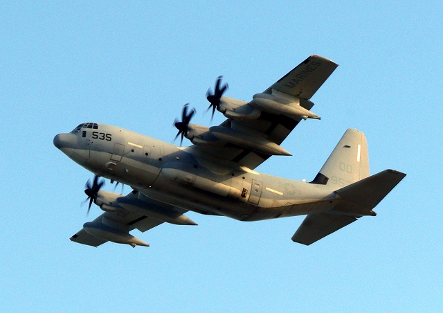 米海兵隊 KC-130J 空中給油機 スーパーハーキュリーズ(岩国基地)、QD 9535番機が旋回 |