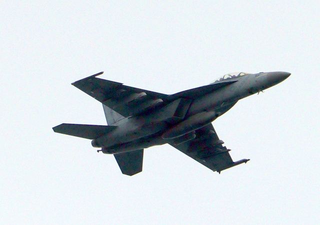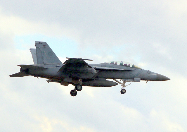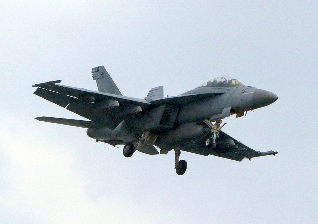 米海軍艦載機 F/A-18F スーパーホーネット 戦闘攻撃機(岩国基地)、NF、107番機が着陸 これで、慌てて退散! |