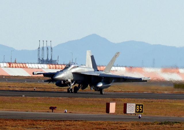 米海軍艦載機 EA-18G グラウラー 電子戦戦闘攻撃機(岩国基地)、NF、504番機が着陸 13時46分に離陸した機。1時間27分の飛行でした。 |