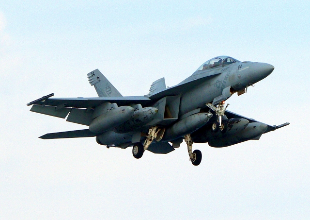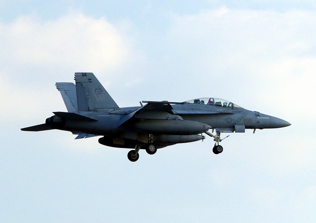米海軍艦載機 F/A-18F スーパーホーネット 戦闘攻撃機(岩国基地)、NF、114番機は着陸 |