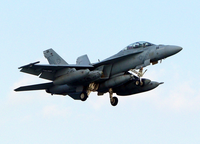 米海軍艦載機 F/A-18F スーパーホーネット 戦闘攻撃機(岩国基地)、NF、114番機が帰還 |