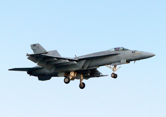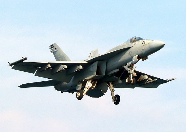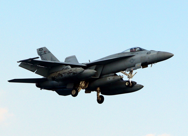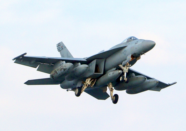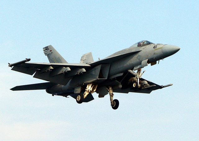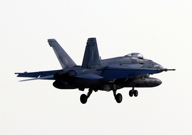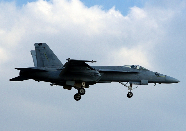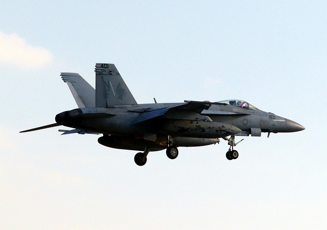 米海軍艦載機 F/A-18E スーパーホーネット 戦闘攻撃機(岩国基地)、NF、411番機が帰還 |