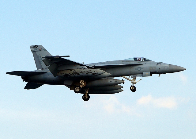 米海軍艦載機 F/A-18E スーパーホーネット 戦闘攻撃機(岩国基地)、NF、401番機が帰還 |