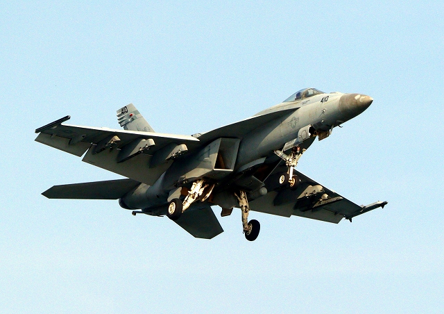 米海軍艦載機 F/A-18E スーパーホーネット 戦闘攻撃機(岩国基地)、NF、410番機が着陸 |