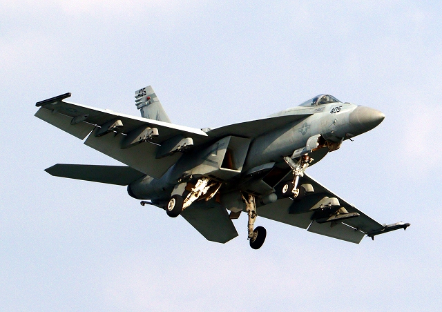 米海軍艦載機 F/A-18E スーパーホーネット 戦闘攻撃機(岩国基地)、NF、405番機が着陸 |