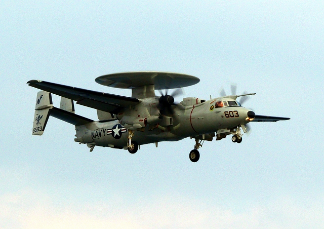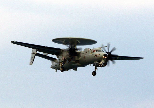 米海軍艦載機 E-2D アドヴァンスド・ホークアイ 早期警戒機(岩国基地)、603番機が旋回 |