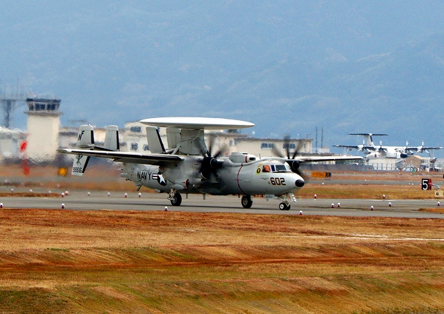 米海軍艦載機 E-2D アドヴァンスド・ホークアイ 早期警戒機(岩国基地)、602番機が着陸 |