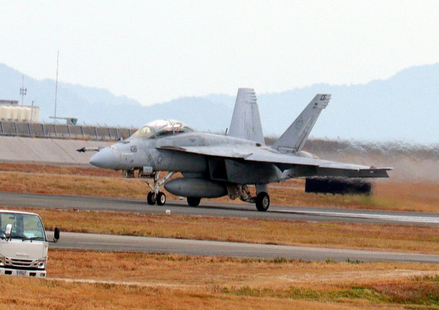 米海軍艦載機 F/A-18F スーパーホーネット 戦闘攻撃機(岩国基地)、NF、106番機が着陸 |