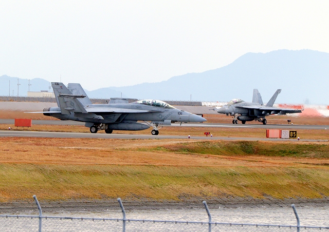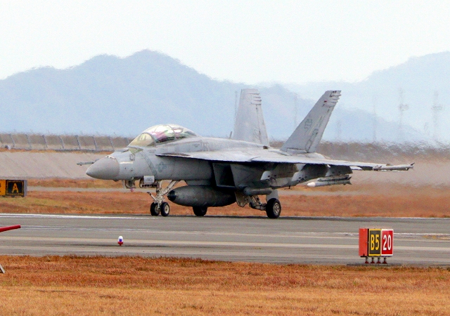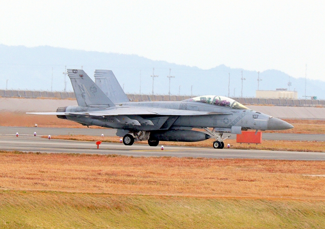 米海軍艦載機 F/A-18F スーパーホーネット 戦闘攻撃機(岩国基地)、NF、107番機が着陸 |
