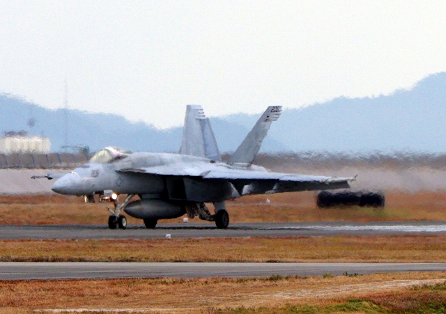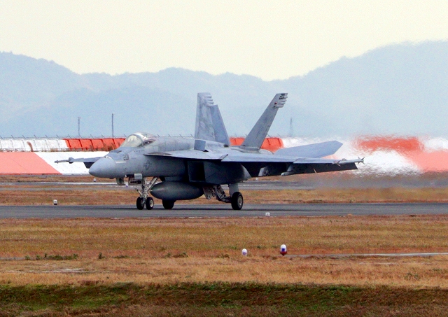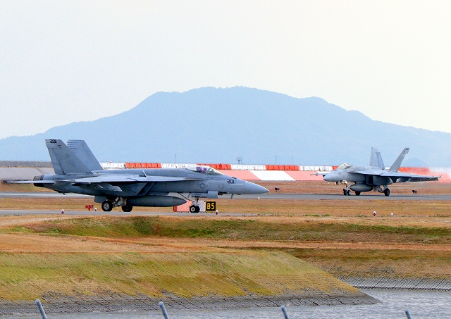 米海軍艦載機 F/A-18E スーパーホーネット 戦闘攻撃機(岩国基地)、NF、201番機が着陸 |
