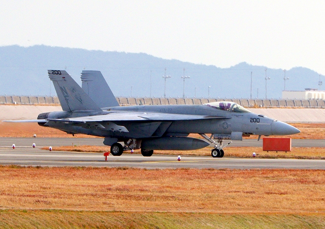 米海軍艦載機 F/A-18E スーパーホーネット 戦闘攻撃機(岩国基地)、NF、200番機が着陸 |
