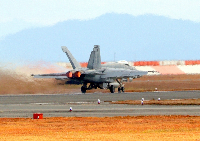米海軍艦載機 F/A-18E スーパーホーネット 戦闘攻撃機(岩国基地)、NF、200番機が離陸 |