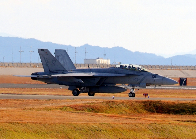 米海軍艦載機 F/A-18F スーパーホーネット 戦闘攻撃機(岩国基地)、NF、106番機が着陸 |