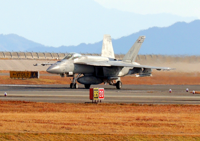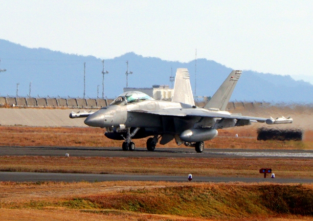 米海軍艦載機 F/A-18E スーパーホーネット 戦闘攻撃機(岩国基地)、NF、405番機が着陸 |