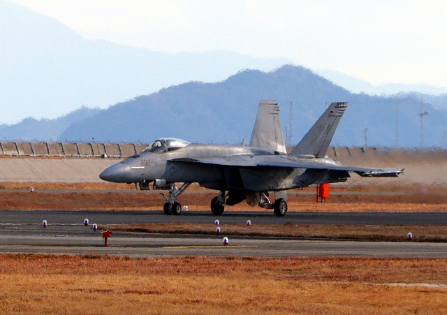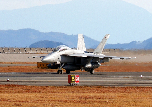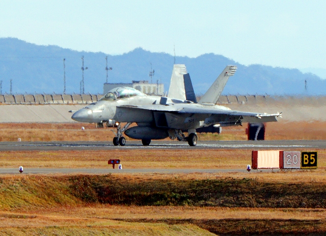 米海軍艦載機 F/A-18E スーパーホーネット 戦闘攻撃機(岩国基地)、NF、200番機が着陸 |