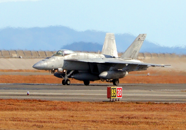 米海軍艦載機 F/A-18E スーパーホーネット 戦闘攻撃機(岩国基地)、NF、405番機が着陸 |