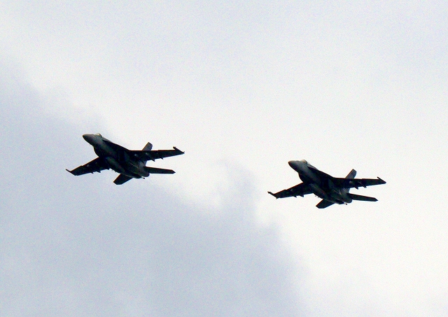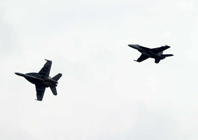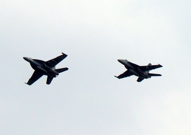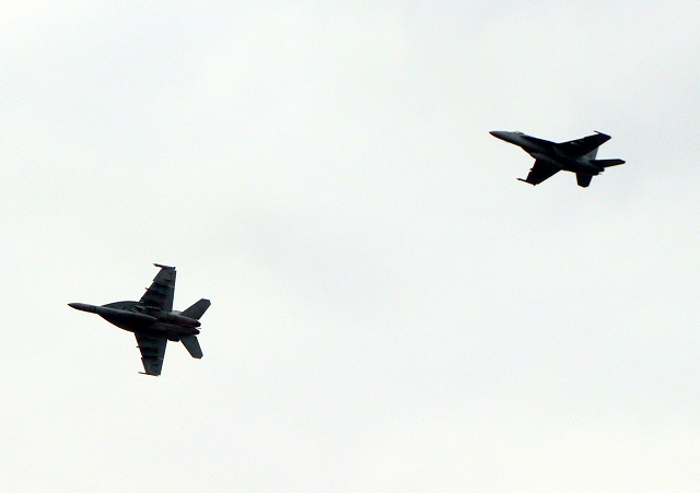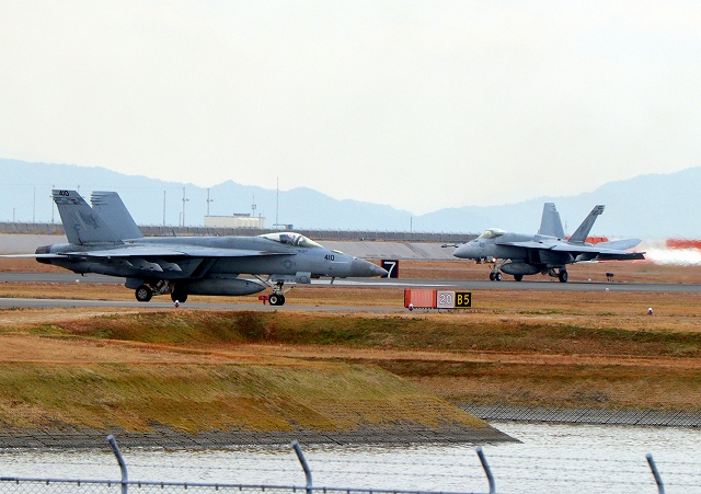 米海軍艦載機 F/A-18E スーパーホーネット 戦闘攻撃機(岩国基地)、NF、400番機、405番機が帰還 |