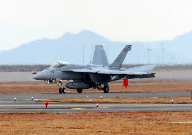 米海軍艦載機 F/A-18E スーパーホーネット 戦闘攻撃機(岩国基地)、NF、405番機が着陸 |