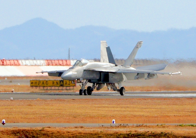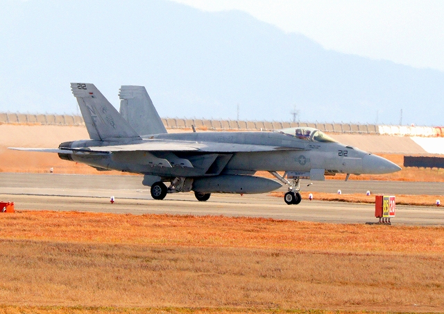 米海軍艦載機 F/A-18E スーパーホーネット 戦闘攻撃機(岩国基地)、NF、212番機が着陸 |