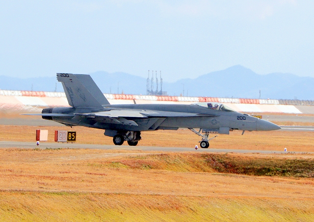 米海軍艦載機 F/A-18E スーパーホーネット 戦闘攻撃機(岩国基地)、NF、200番機が着陸 |