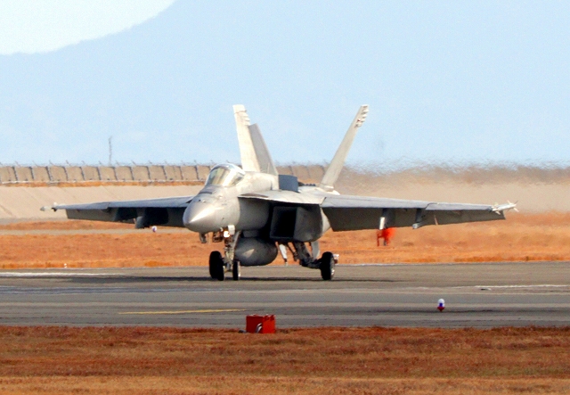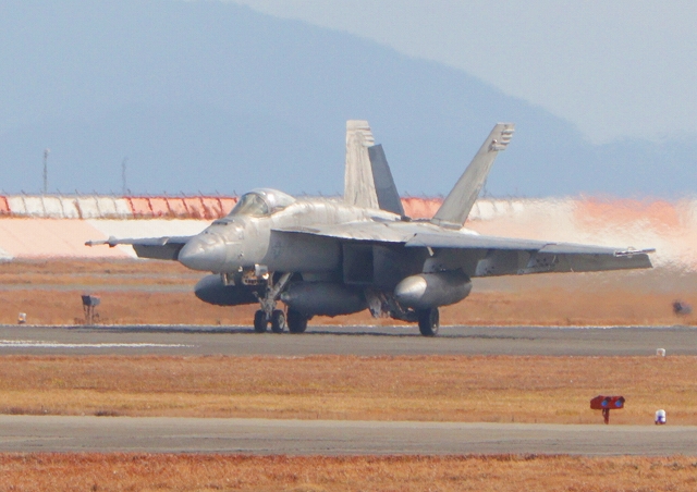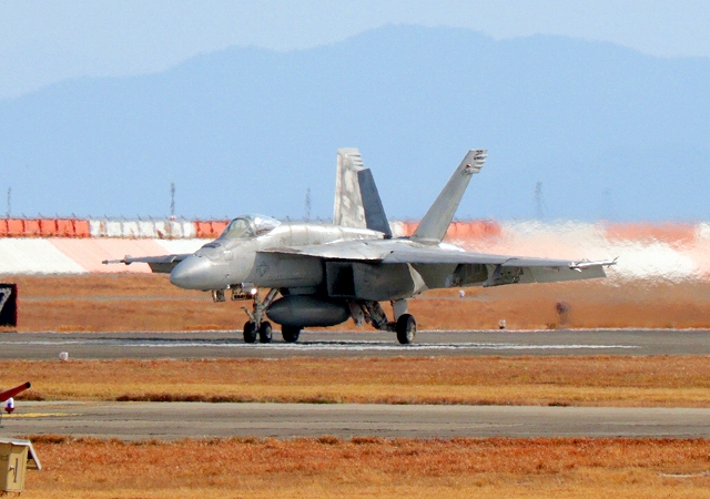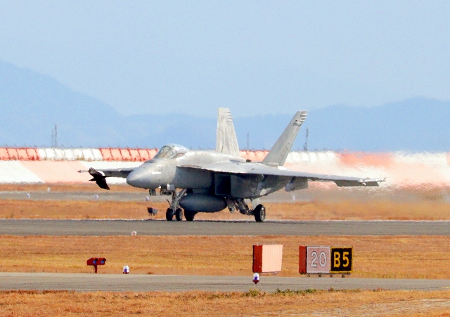 米海軍艦載機 F/A-18E スーパーホーネット 戦闘攻撃機(岩国基地)、NF、211番機が着陸 |