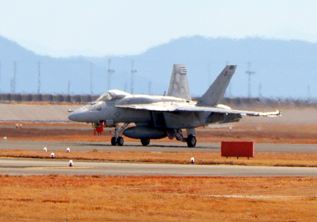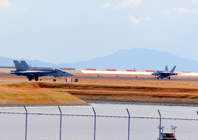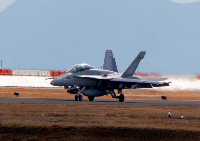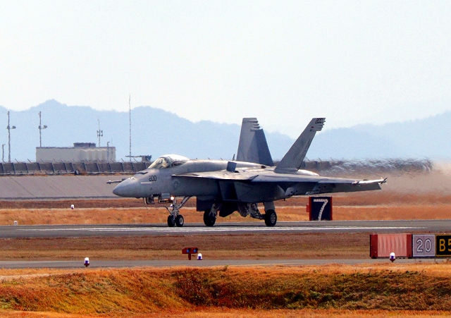 米海軍艦載機 F/A-18E スーパーホーネット 戦闘攻撃機(岩国基地)、NF、201番機が着陸 |