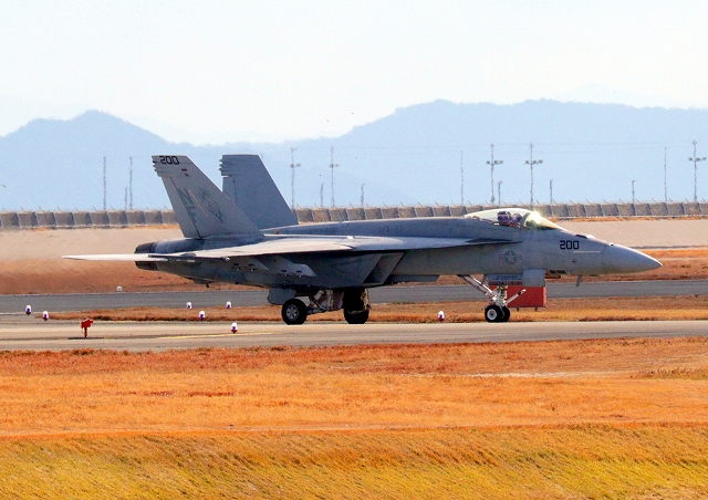 米海軍艦載機 F/A-18E スーパーホーネット 戦闘攻撃機(岩国基地)、NF、200番機が着陸 |